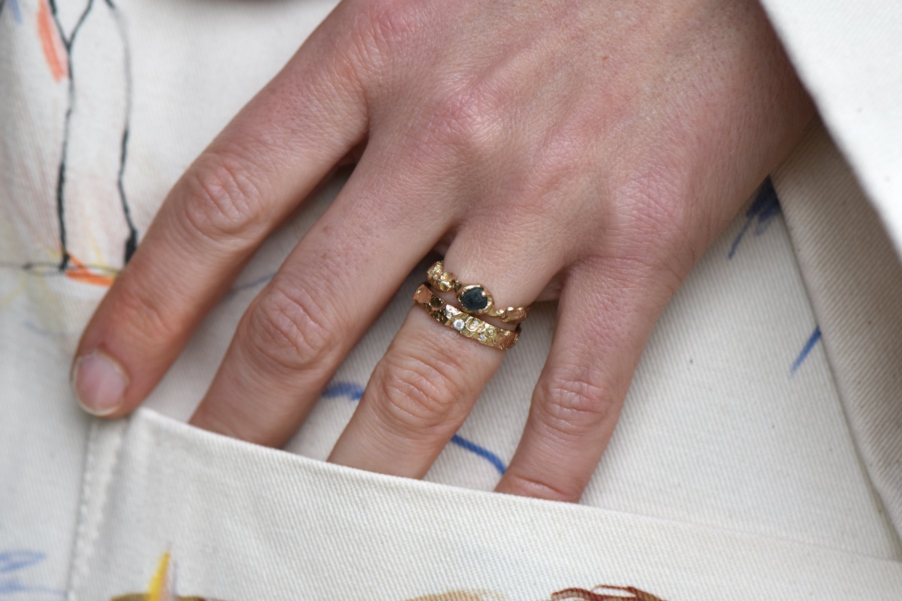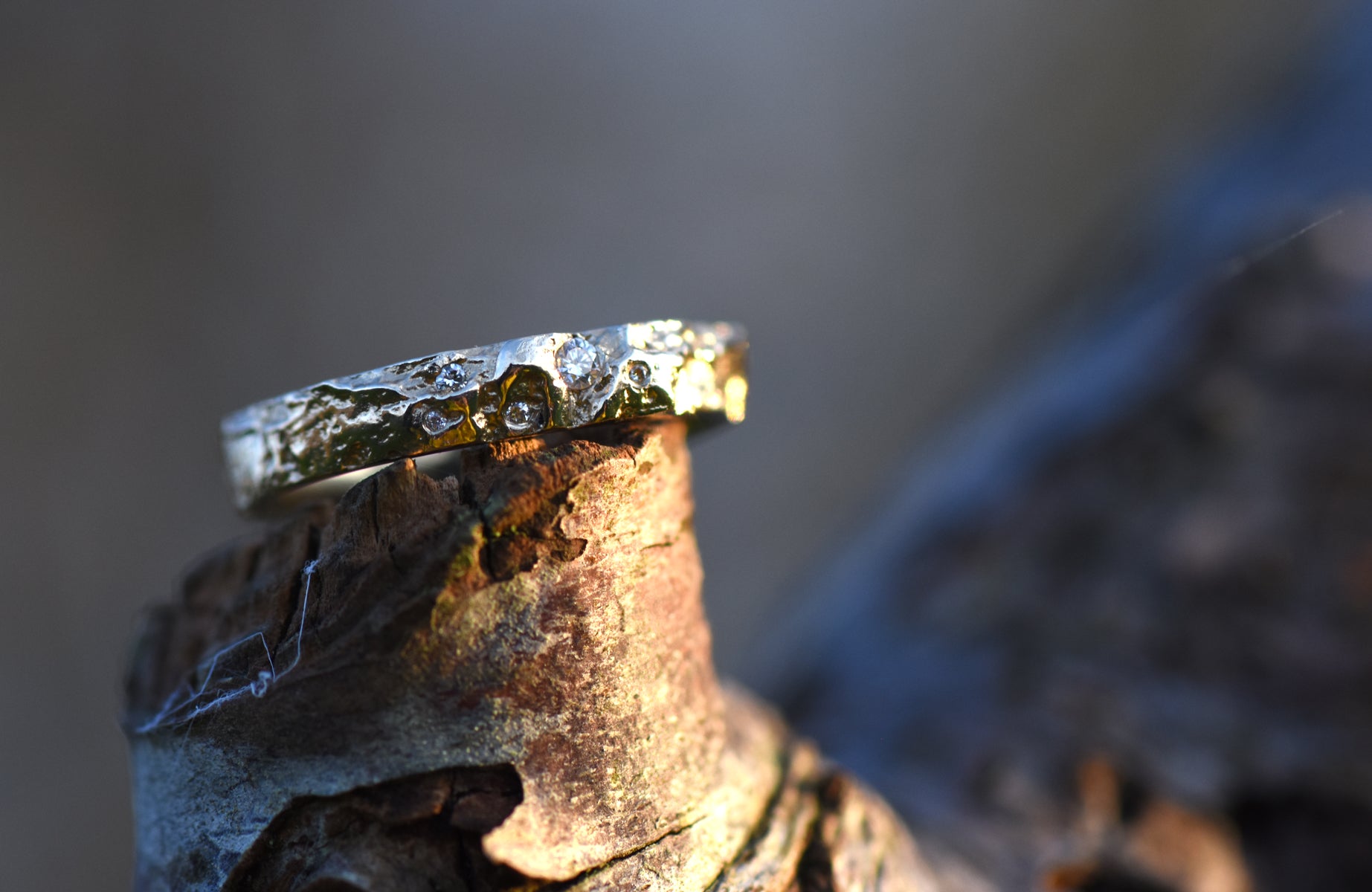 The band is cast from the bark of an English Oak tree, using 14ct recycled yellow gold and 5 brilliant-cut white diamond are nestled into the crevices of the ring .