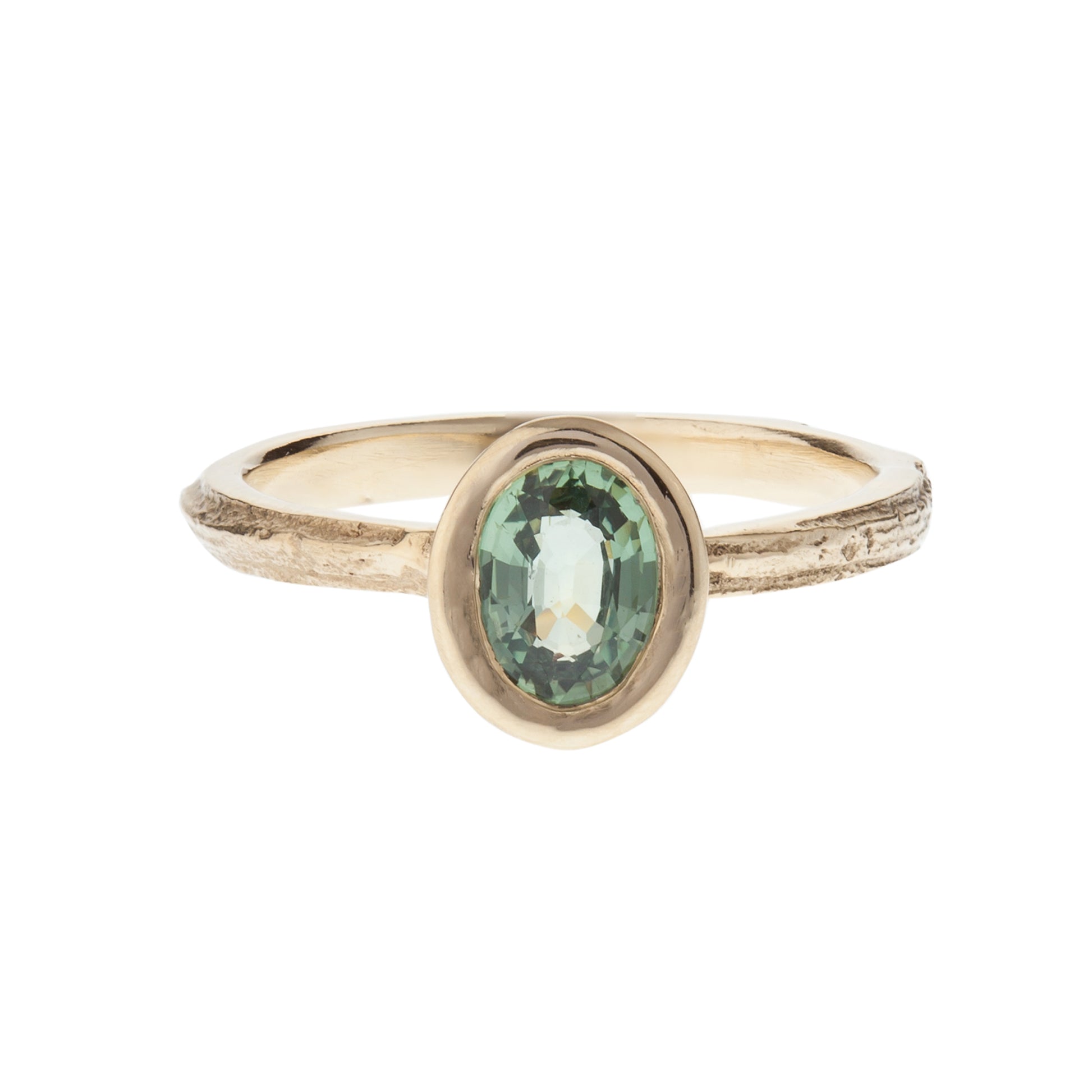 Inspired by the English Oak Tree, this solitaire ring features a mint tourmaline mounted onto a 9ct yellow gold band.