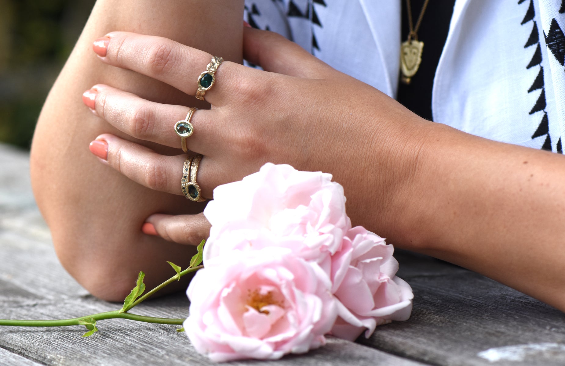 Inspired by the Hawthorn tree, this ring features a green tourmaline mounted onto a 9ct yellow gold band.