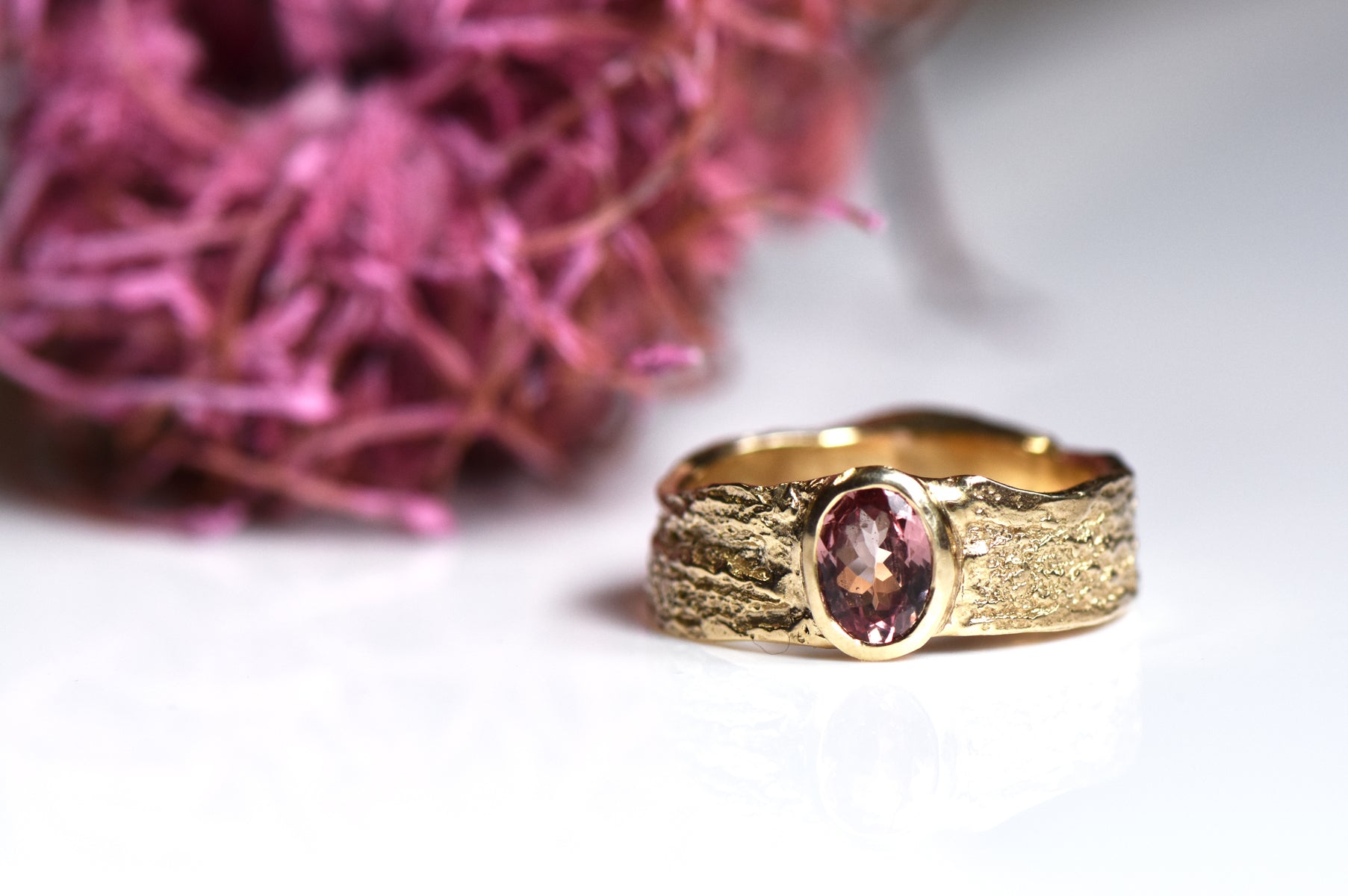 Inspired by the London Plane tree, this ring features a pink sapphire mounted onto a 9ct yellow gold band.