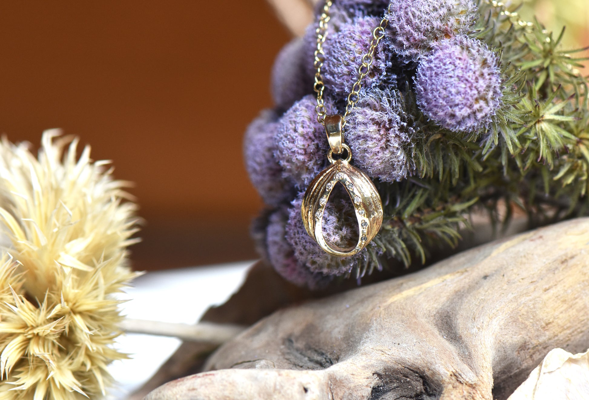 This necklace is made from the bark of an English Oak tree. A simple elegant pear shaped pendant, inspired by nature, adorned by diamonds!